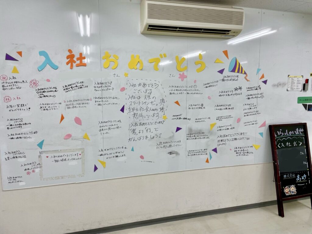 ホワイトボードにはパートさんを含めた全社員からの激励メッセージ!